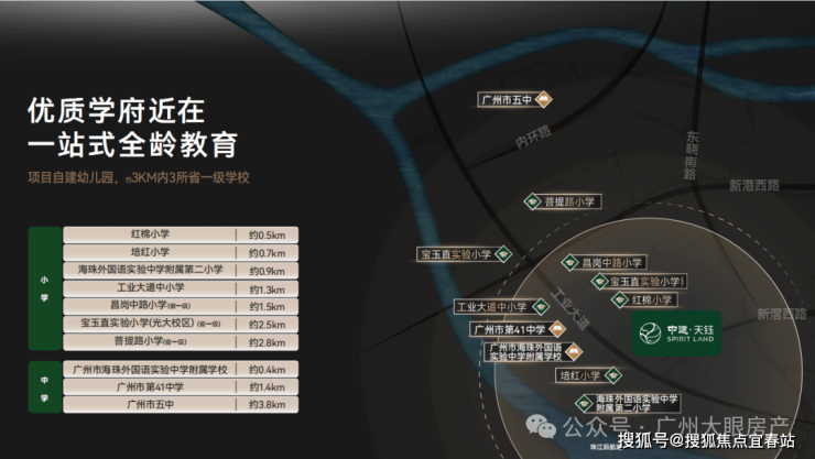 项目自带一所幼儿园,小学以上就要依赖周边,距离最近的公办小学是海珠区金碧第一小学(西校区)和海珠区石溪劬劳小学,两所小学对口初中分别在第五组和第七组。
