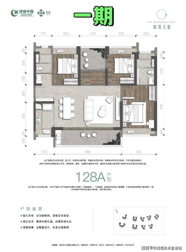 128㎡的4房2厅2卫(一期A户型),设计的是横厅南北通透格局,餐客厅一体化6.8米开间,4个卧室分别做到了3.3米/2.7米/2.7米/2.35米的宽度,U型厨房,公卫三段式分离设计,得房率:75.86%(不含赠送),阳台主朝西南或西北向。