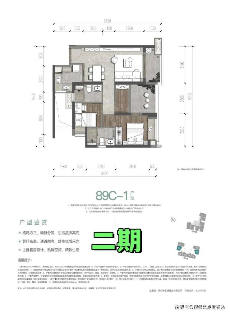 89㎡的3房2厅2卫(二期C户型),设计的是经典竖厅格局,餐客厅一体化,客厅3.4米开间,三开间朝南,3个卧室分别做到了3米/2.8米/2.4米的宽度,U型厨房,阳台1.5米进深,得房率:72.96%(不含赠送),西南朝向。