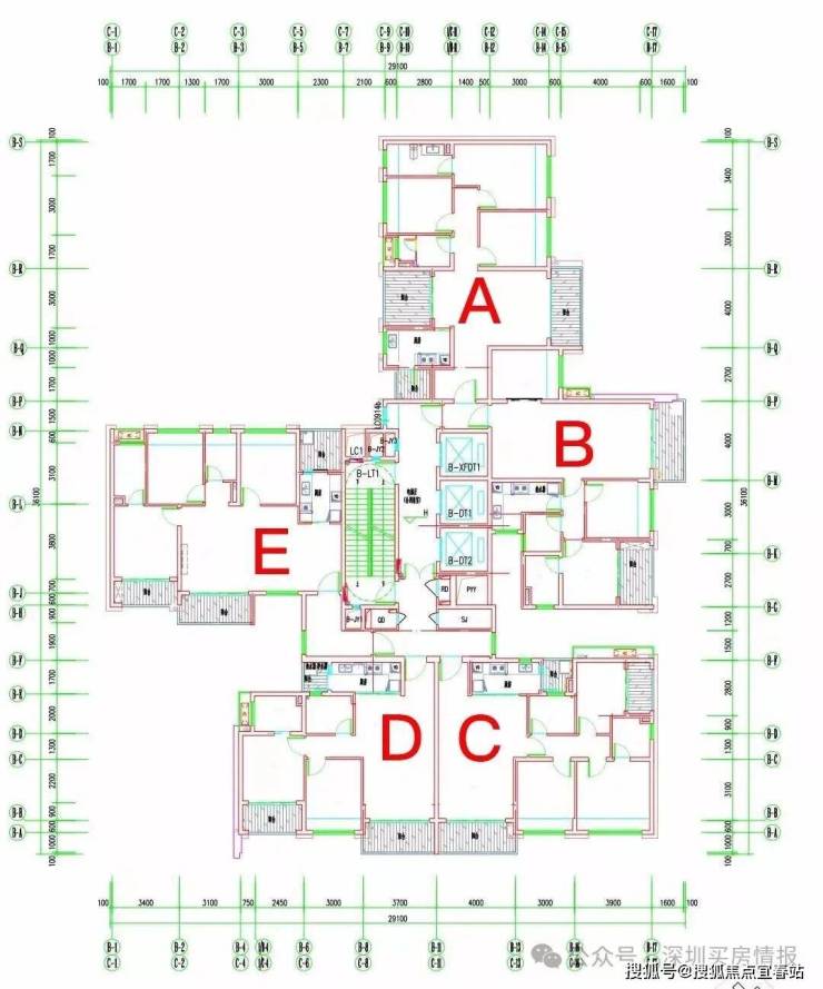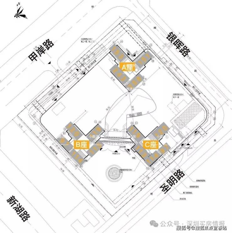项目三栋住宅均为塔楼设计,A座三梯四户,B座、C座均为三梯五户,各栋户型分布平面图如下: