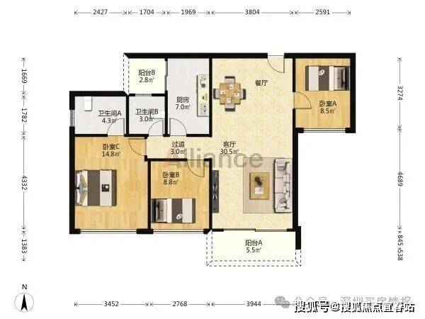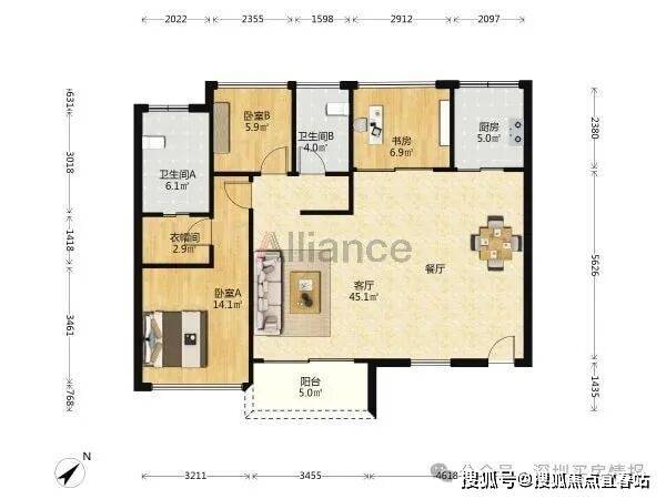 该户型朝西南和东南,南北透通,带两个阳台,餐厅和入户都可拓展,书房可改4房,不足之处在于玄关、过道处有点浪费面积。