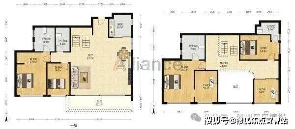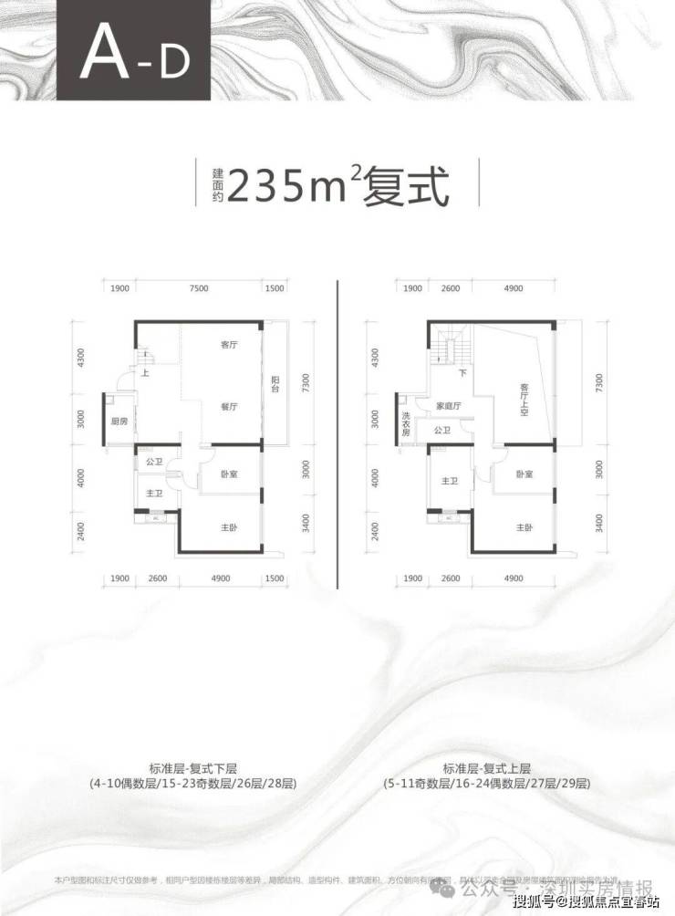 以上两种复式户型格局大体相似,具体面积有些许不同,为东南和西南朝向,4个卫生间配置也算比较奢侈的了。客厅开间达7.3米,出进深1.6米的阳台,视野开拓感还是比较好的。