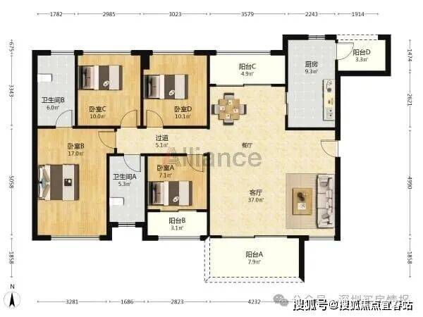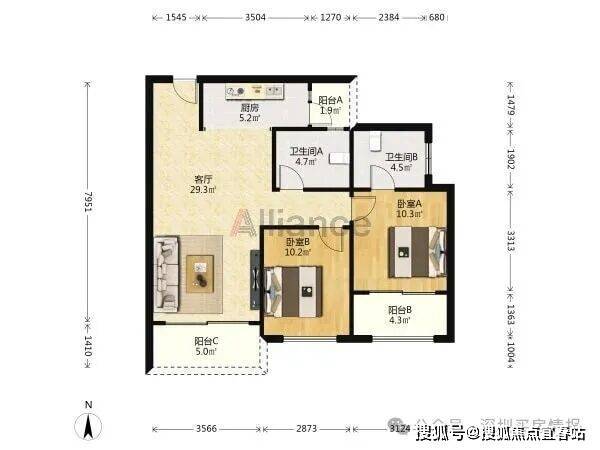 B/C座 A户型:约119㎡3房2厅2卫