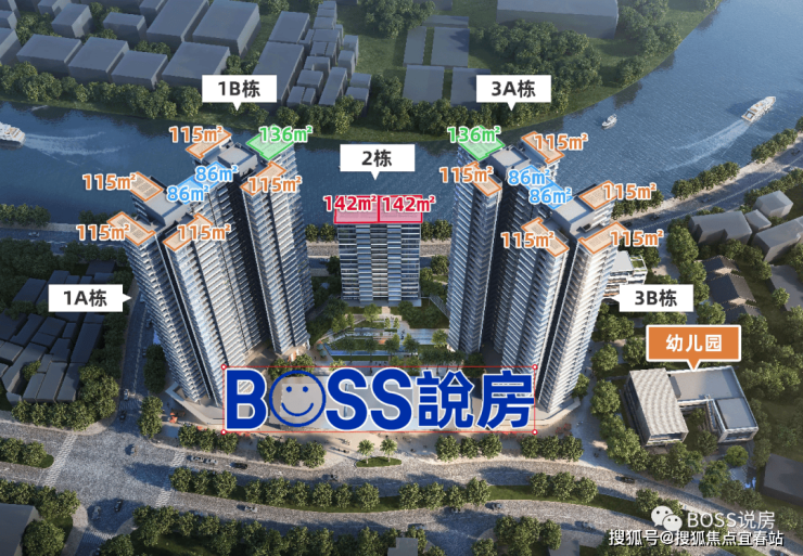 楼盘采用了一种类似于环抱式的围合式布局,由1A、1B、3A、3B四栋31-32层的高层洋房(塔楼),和2\4号楼5-17层高的小高层(板楼)两栋住宅楼+1所幼儿园组成。