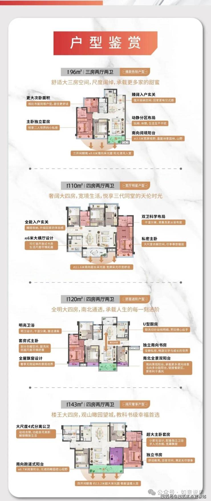 项目全系户型均为市场主流N+1户型,建面约96-144㎡3-4房,户型高拓、舒适、实用,多一些使用空间,生活少一些将就。