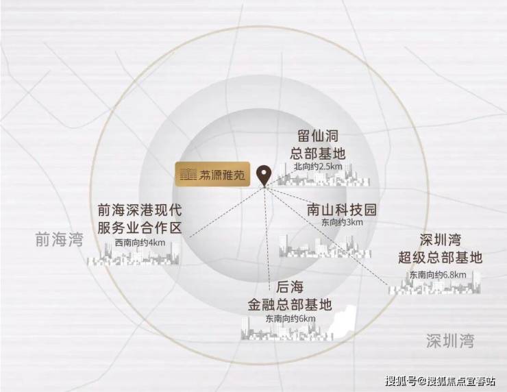 后海金融总部基地、深圳湾超级总部基地(东南向约6km):中国总部企业最为密集区域之一,规划就业人口约为54万人。