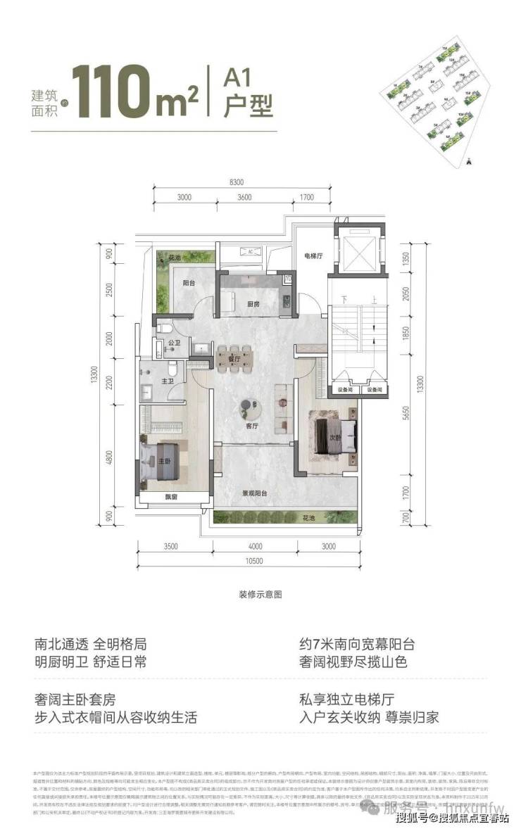 8.得房率:私家电梯厅私密独享,户内超高赠送,户户近100%得房率。
