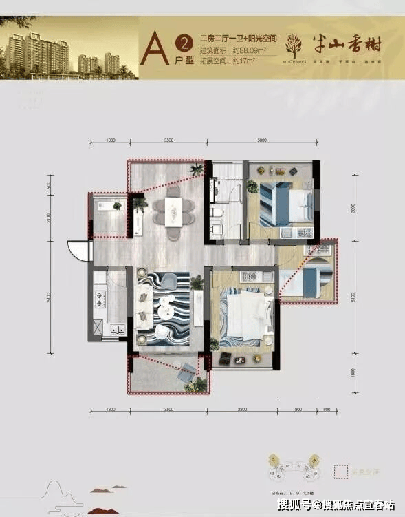 A2户型88.09㎡ 赠约17㎡ 三房二厅一卫