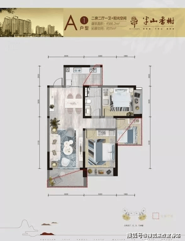 A1户型86.2㎡ 赠约11㎡ 三房二厅一卫