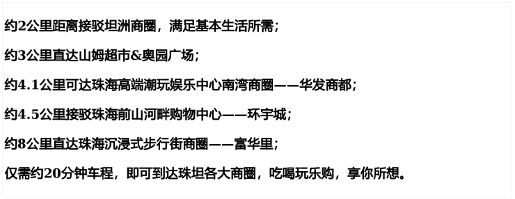 约5~15分钟车程可达珠海前山、拱北、吉大,以及坦北区域;