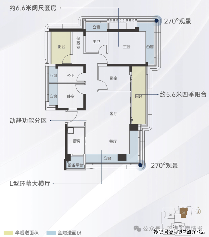 113㎡的4房2厅2卫,设计的是横厅南北通透格局,进门入户玄关,客餐厅一体化设计,餐厅位双飘窗无敌视野,全屋6个飘窗面,客厅连接次卧出5.6米长的巨幕大阳台,L型厨房带1个设备平台,卫生间干湿分离也带1个设备平台,得房率约94%(包含赠送),正东朝向。660万起