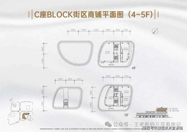 1F 挑高6m 户型建筑面积段约:67-170 ㎡(27套)2F 挑高4.5m 户型建筑面积段约:83-322㎡(14套)3F 挑高4.5m 户型建筑面积段约:75-200 ㎡(6套)4F 挑高4.5m 5F挑高4m 户型建筑面积段约:59-227㎡(5套)世茂三亚国际金融中心