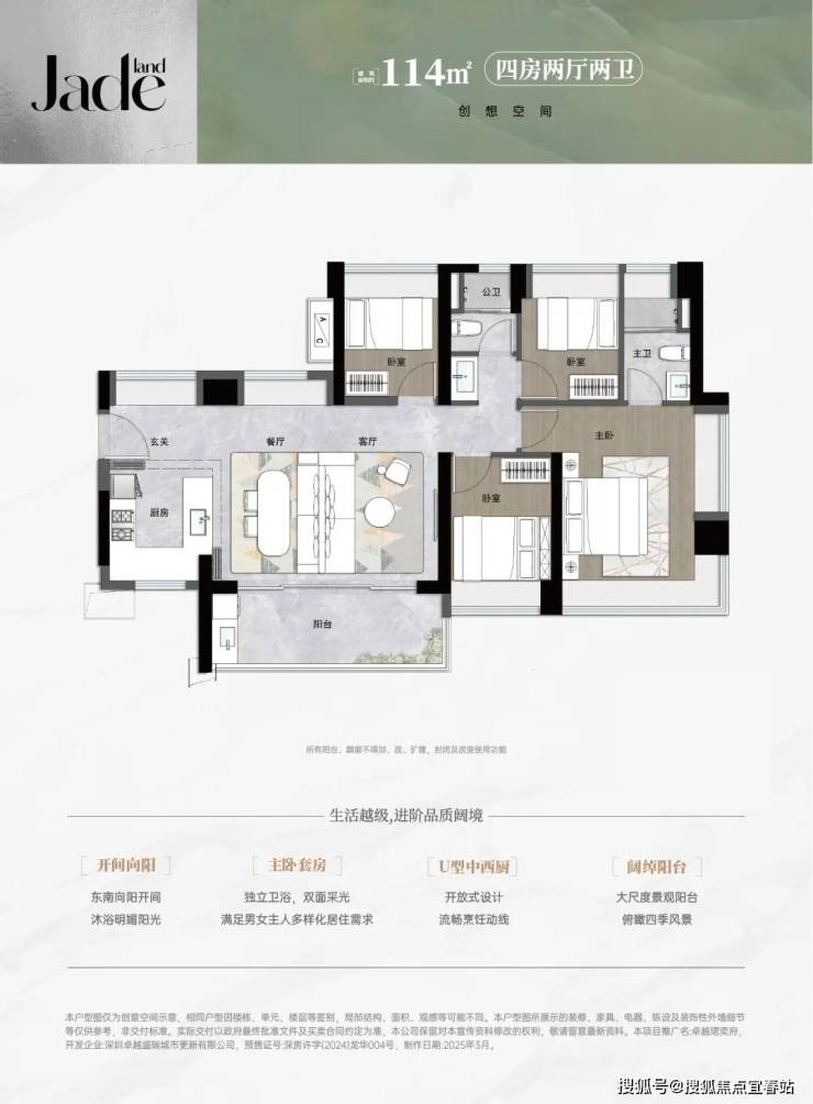 114平㎡的4房2厅2卫,设计的是横厅南北通透格局,进门入户玄关,LDKB一体化,五开间朝南,全屋9面飘窗,主卧大套间,U型厨房,卫生间干湿式分离,得房率约93.18%(包含赠送),阳台主朝东南向。
