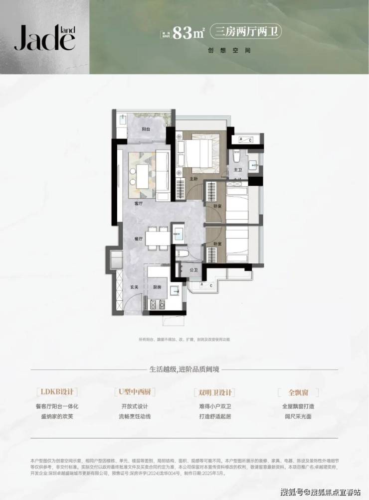 83㎡的3房2厅2卫,设计的是竖厅格局,进门入户玄关,LDKB一体化,S墙设计预留冰箱卡槽位,U型厨房,主卫少了淋浴,公卫三段式分离,得房率约90.33%(包含赠送),阳台西北朝向。