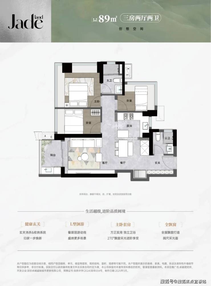 89㎡的3房2厅2卫,设计的是经典竖厅格局,进门入户玄关,LDKB一体化,S墙设计预留冰箱卡槽位,三开间朝南,主卧+1个次卧270度飘窗,L型灵动式厨房,卫生间干湿分离,得房率约89.35%(包含赠送),西南或东南朝向。
