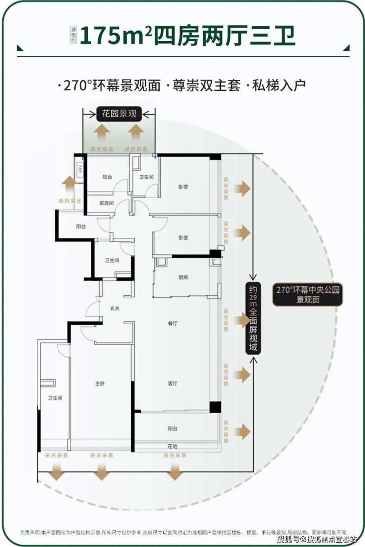 如面向中央园林位置的一线楼栋,总的园林景观面,就达到了280米。