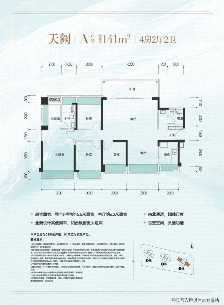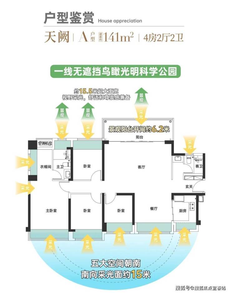 •以豪宅标准打造超大户型面宽,约141㎡大四房户型,整个户型15.5米超大面宽、南北通透,客厅6.2米超大面宽,甚至具备可变“五房”的灵活空间改造潜力。