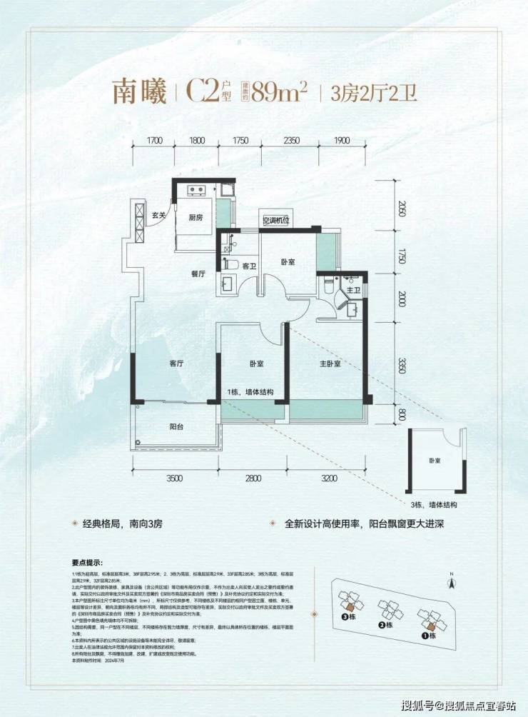 C户型 | 建面约89㎡三室两厅两卫:经典实用