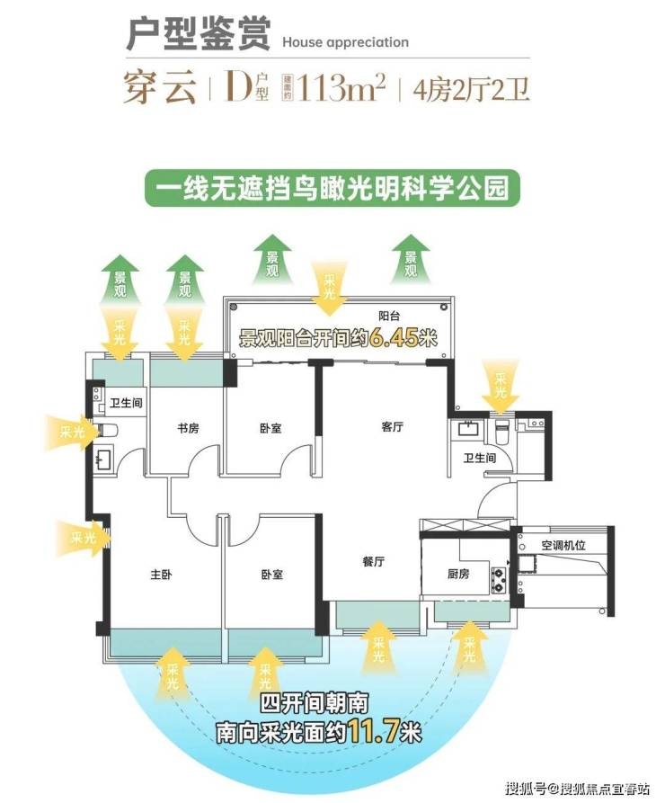 •约6.45米开间的超级景观阳台,获得约11.61平的使用空间,堪比市面约140平左右的巨幕效果!同时客厅旁的次卧与书房也都是大观景面。无论是站在大阳台上还是坐在书房里,抬头即可将科学公园的青翠尽收眼底。