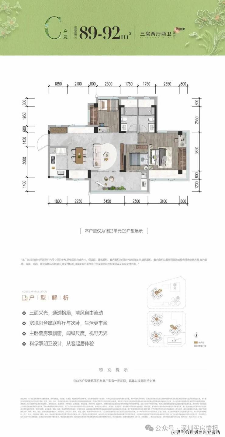 招商会展湾雍境名邸位于宝安沙井大前海会展湾片区的招商会展湾雍境名邸,本次是招商会展湾雍境二期,首推1栋3单元的195套房源,面积段有80㎡3房1卫,91㎡3房2卫,92㎡3房2卫3种户型,是3梯7户的普通高层,预计2027年9月精装交楼。