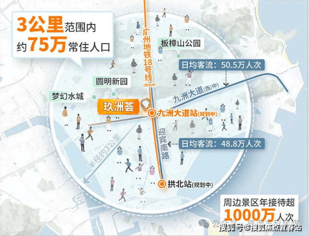 项目3km范围辐射75万消费客流;距离拱北口岸仅1km范围,周边437个小区,且绝大部分写字楼距离项目不足1km;146栋星级写字楼群绕、圆明新园等4A旅游景点年客流量超4000万人次。磅礴客流,消费需求庞大,客流无忧。