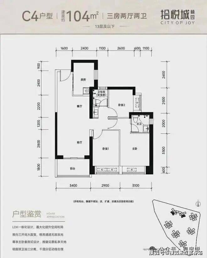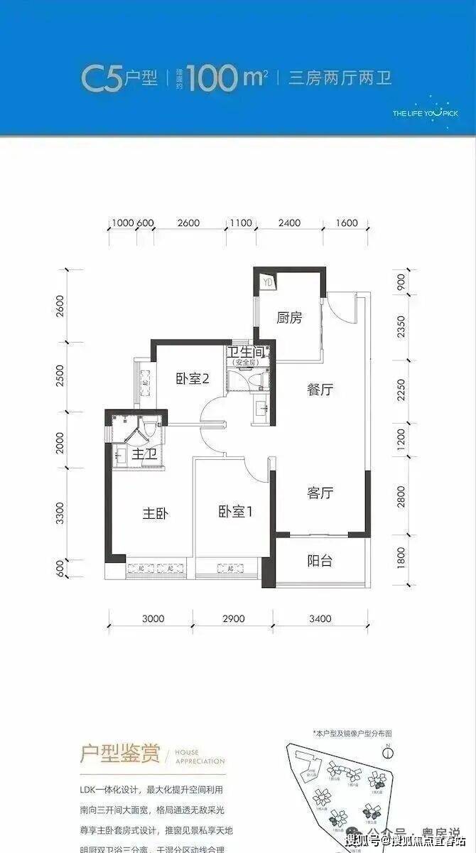 100平三房:设计的是竖厅格局,进门入户玄关,客厅3.4米开间,LDKB一体化设计,3个卧室分别做到了3米/2.9米/2.5米的宽度,U型厨房,公卫三段式分离,得房率:77.14%(不含赠送),阳台1.8米宽度,西南或东南朝向。