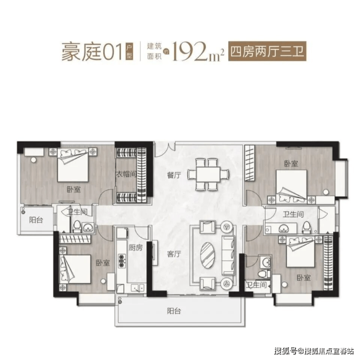 豪庭01单元——【 192㎡ 东南向 四房两厅三卫 】