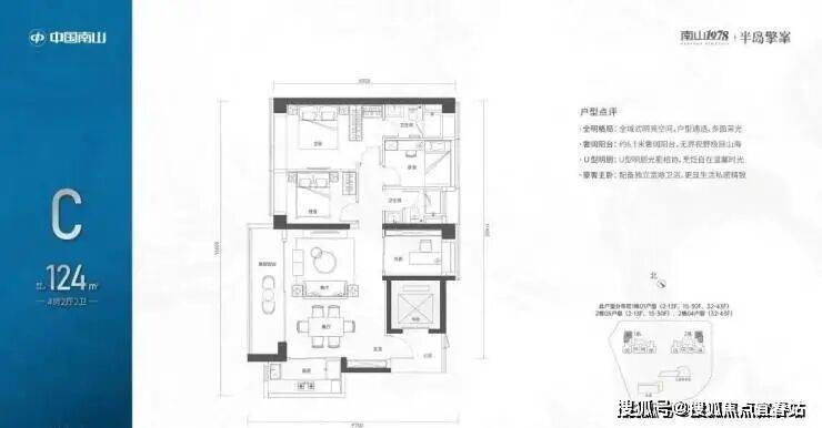 【124㎡的4房2厅2卫】1栋01/2栋05户型,电梯入户送独立公区,横厅南北通透格局,客餐厅6.1米开间,五开间朝南,主卧大套间设计,6.1米长观景大阳台,U型厨房,得房率:72.07%(不含赠送)西北或东南朝向;