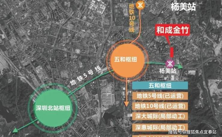 项目距离5号线杨美站约200米,2站到五和枢纽站可换乘10号线/深大城际,4站到布吉枢纽站可换乘3/14号线,4站到深圳北站可换乘4/6号线,还有高铁线路。