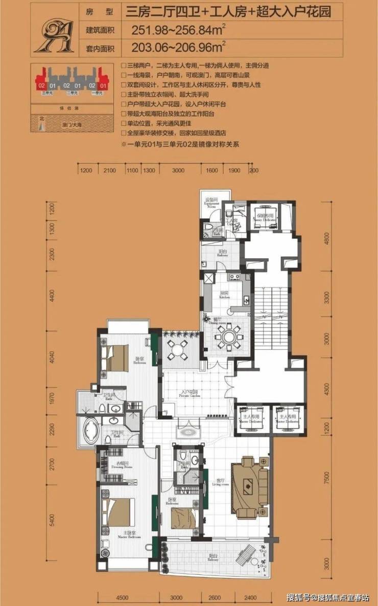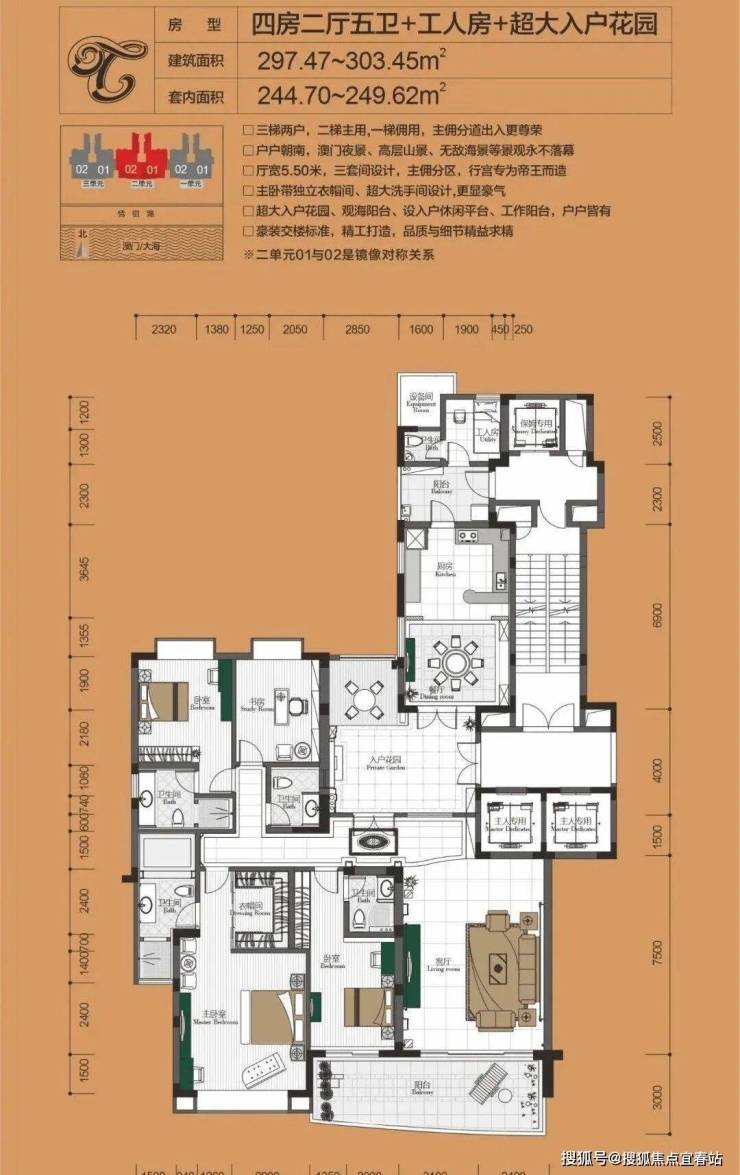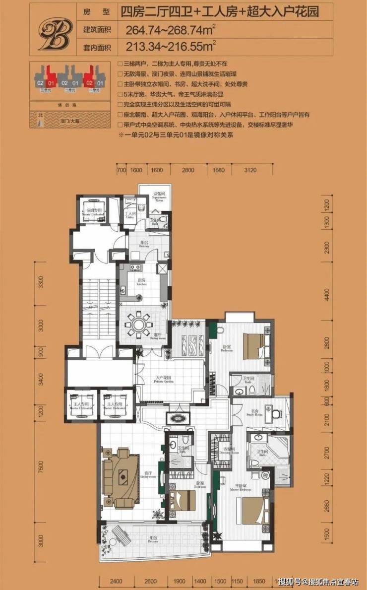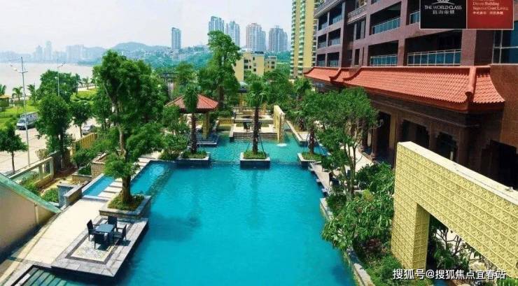 小区规划高端:绿化率 48%,中式园林 + 恒温泳池,三梯两户(主佣分道),一线海景、户户朝南,双套间 + 入户花园设计。