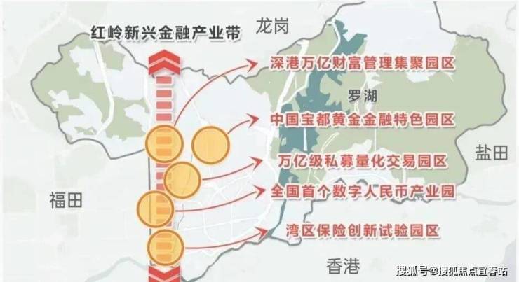 大湾区金融极:其中红岭新兴金融产业带作为"深圳三大金融增长极”之一,与前海国际金融城、福田香蜜湖金融街并列,罗湖将先天的金融优势及政府的政策支持,以金融产业赋能罗湖新发展,助力深圳成为大湾区经济发展引擎。( 信息来源:罗湖发布)