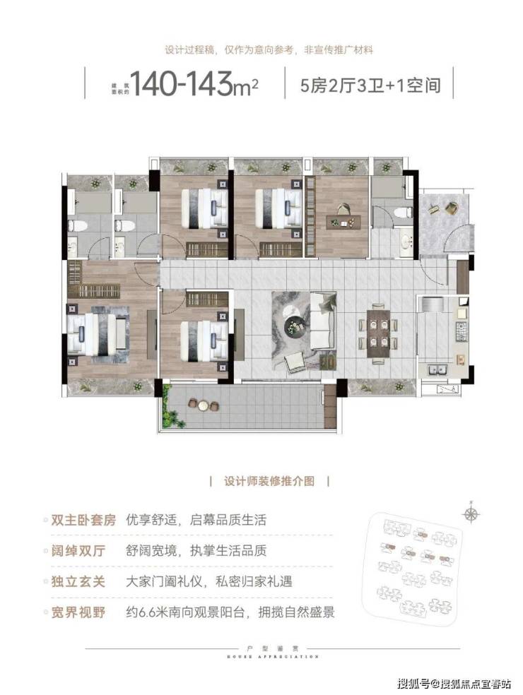 建面122-126平4+1房,双主套配置,四开间朝南采光,大横厅设计,全屋8个飘窗+入户花园+观景阳台+厨房窗户,整整11个采光面,所有卫生间都带飘窗。