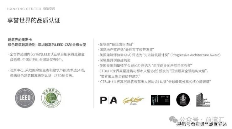 国际资质标准:LEED铂金级认证 . 绿色建筑三星认证 . 美国建筑师协会(AIA)