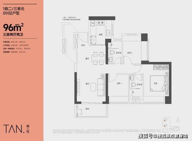 96㎡的3房2厅2卫,设计的是经典竖厅格局,LKDB一体化设计,进门入户玄关,动静分区,三开间朝南,有1个次卧做的双飘窗,U型厨房,得房率:74.34%(不含赠送),全部西南朝向。