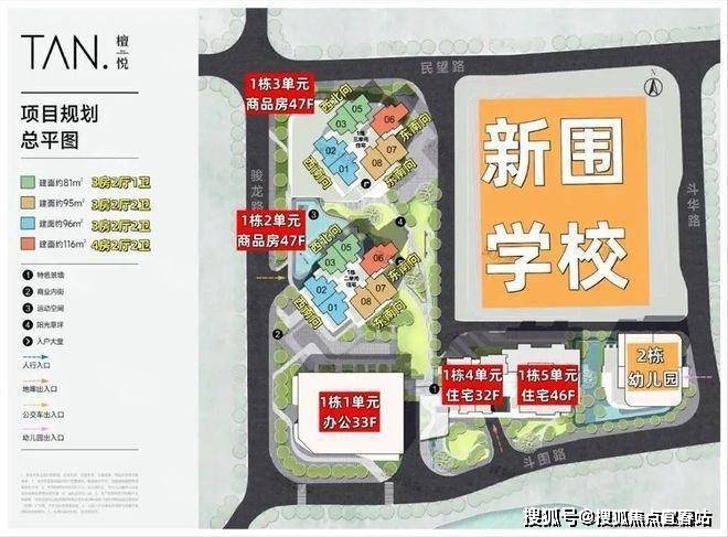 龙华【檀悦府】总占地面积约1.6万㎡,总建筑面积约19万㎡,计容建筑面积约14.1万㎡,容积率8.82,绿化率40.12%,共由4栋32-47层高住宅+1栋33层办公组成,其中1栋1单元办公33F,1栋2/3单元商品房47F,1栋4单元住宅32F,1栋5单元住宅46F,2栋配建1所6班制幼儿园。