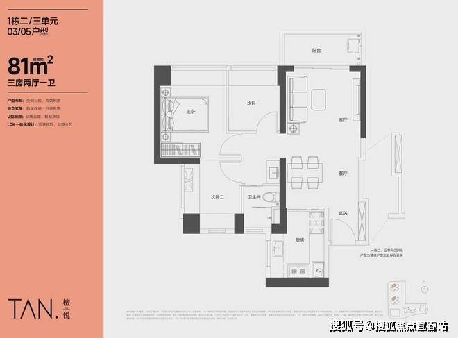 81㎡的3房2厅1卫,设计的是竖厅格局,LKDB一体化设计,进门入户玄关,有1个次卧做的双飘窗,U型厨房,卫生间三段式分离,得房率:74.34%(不含赠送),全部西北朝向。