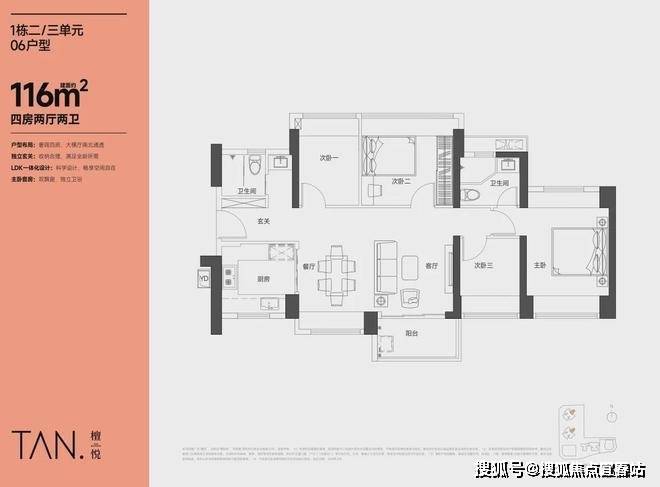 116㎡的4房2厅2卫,设计的是横厅南北通透格局,LKDB一体化设计,进门入户玄关,五开间朝南,超大宽面,主卧南北通设计,U型厨房,得房率:74.35%(不含赠送),阳台主朝东南向。