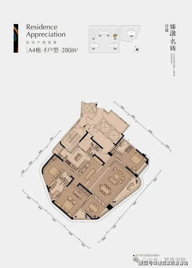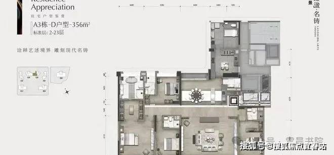 约 280 平四房格局非常规格,每个空间独立设计,对开发商的产品打磨能力有一定考验。建面322-403㎡南向大平层、头排江景