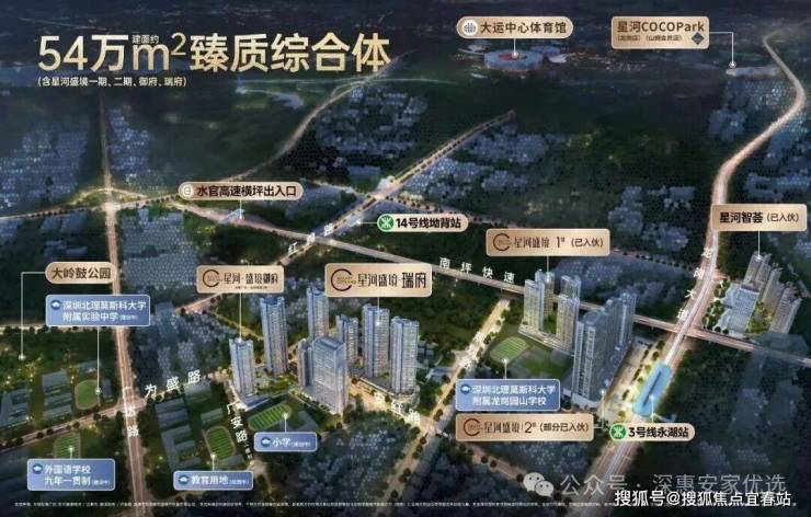 星河盛境3期,位于深圳市龙岗区园山街道,地处大运板块核心区域,毗邻地铁3号线永湖站及14号线坳背站,是双地铁覆盖的TOD综合体项目。项目周边交通网络发达,14号线可1站直达大运枢纽,5站至罗湖、6站至福田,规划中的21号线和33号线将进一步强化与坂田、南山及机场东的快速连接,形成覆盖全城的“五纵四横”路网结构(水官高速、龙岗大道等),便捷通达深圳核心区域。