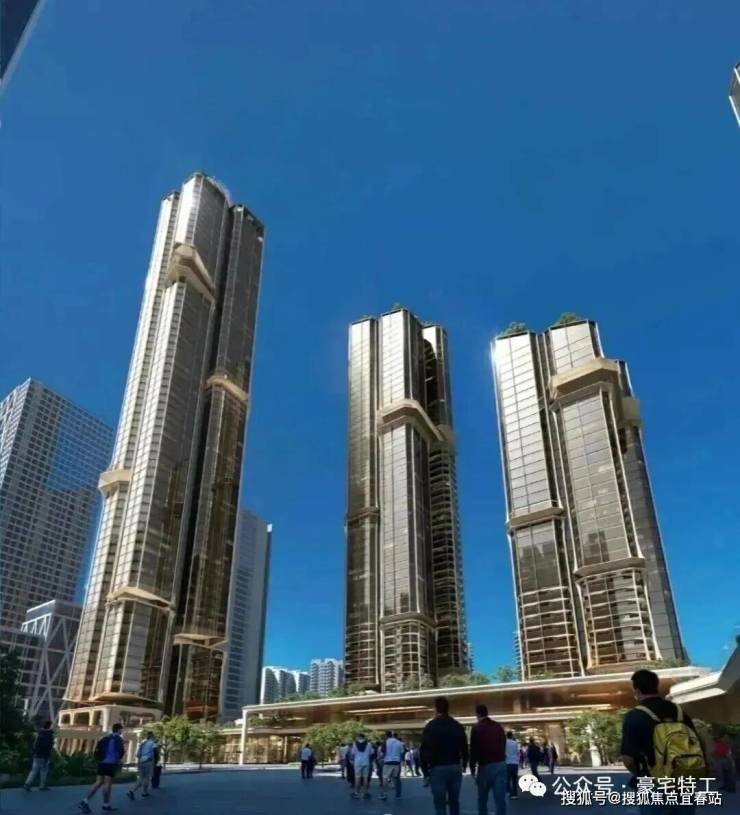 项目规划5栋超高层住宅,采用全玻璃幕墙设计,实用率超95%,主力户型为209㎡以上大平层。项目以“第四代住宅”标准打造,配备空中连廊、星空会所、架空泳池等共享空间,并融入垂直绿化体系