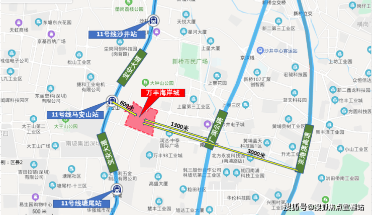 项目距离11号线马安山站直线距离约600米左右,距离项目最近的地方只有300米左右,目前11号线可与深圳地铁1号、2号、3号、5号、6号、7号、9号、12号这8条线路直接换乘。道路交通方面,项目附近有两条主干道,距离宝安大道直线距离约600米左右,距离广深公路约1.3公里左右,这两条主干道直接对接深圳外环高速,通过外环高速可快速驾车通勤深圳各区,较为便捷。另外项目距离京港澳高速直线距离约3公里,通过此高速路可通达全国各地。
