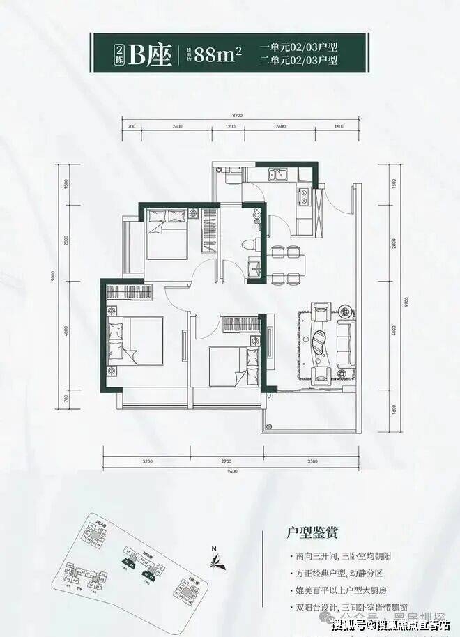 88㎡三房两厅两卫(2 栋 B 座一 / 二单元 02/03 户型)