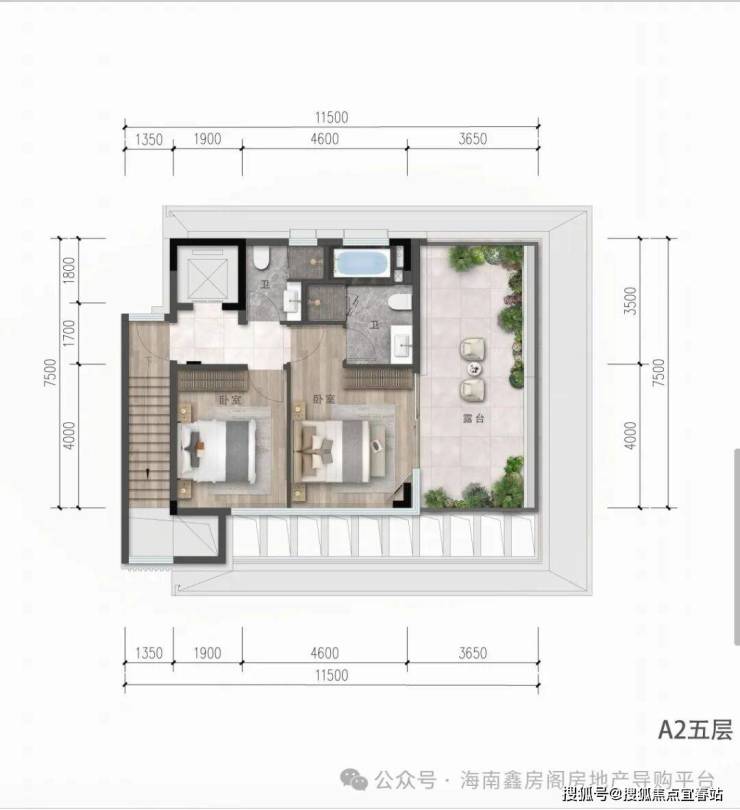 A2上叠建筑面积165㎡,3F2T4W,赠送约165平米(含地下车库65平米,4楼庭院面积83平米以及5楼阳台30平米,共4层(负一层车库+首层+4层+5层)客厅层高3.3米,卧室层高3.3米,地下车库挑高3.9米。(备注:数据仅供参考,具体以政府部门最终审定的图纸和销售合同为准。)
