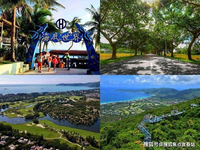 亚龙湾国际高尔夫球场、红峡谷高尔夫球场、玫瑰谷、天堂热带雨林度假公园、最美公路太阳湾,红树林湿地保护区,亚龙湾海岸线等