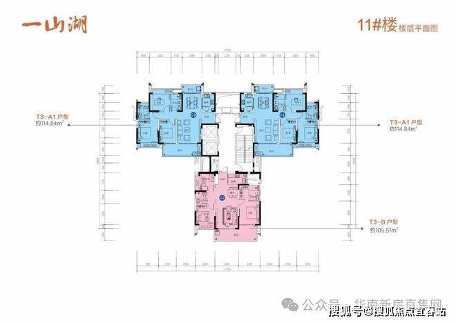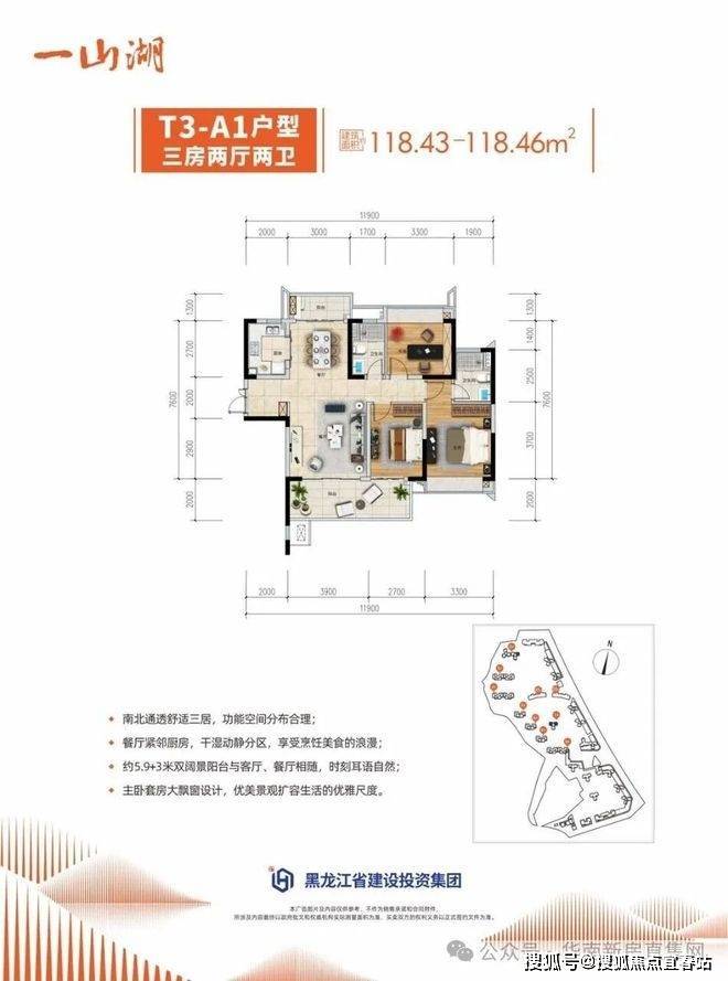 面积:105-119㎡三房两厅两卫11.12号楼2梯3户 总高:16-19层