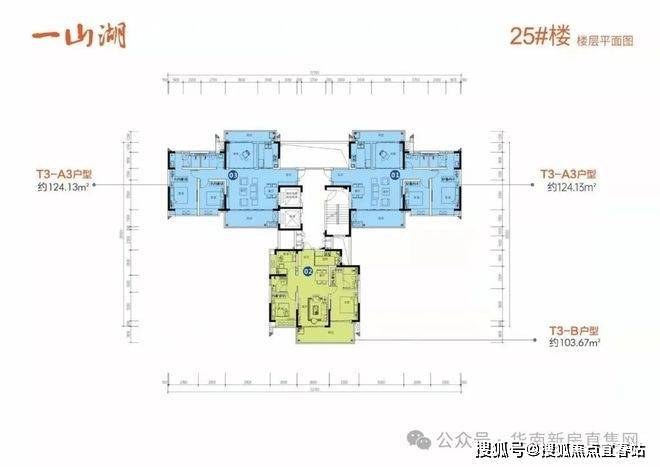 面积:103-125㎡三房两厅两卫20.21.24.25号楼2梯3户 总高:16层