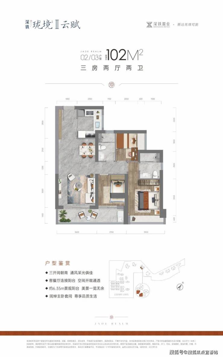 102㎡的3房2厅2卫,设计的是经典竖厅格局,进门入户玄关,客厅3.65米开间,LDKB一体化设计,动静分区,三开间朝南,3个卧室分别做到了主卧约15㎡/次卧8.1㎡/次卧6㎡(包含墙体飘窗),客厅连接次卧出6.35米长的大阳台,U型厨房,卫生间干湿分离,得房率约76%(不含赠送),东南或西南朝向。