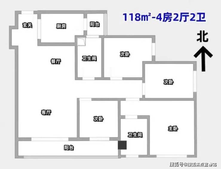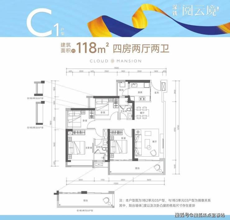 118㎡的4房2厅2卫(C1户型,1栋2单元/3单元03户型),设计的是经典竖厅格局,进门独立玄关,客厅3.5米开间,LDKB一体化设计,动静分区,四开间朝南,4个卧室分别做到了3.2米/2.8米/2.55米/2.35米的宽度,客厅连接次卧出6.4米长的大阳台,二字型厨房带1个小生活阳台,得房率75-77%(不含赠送),阳台都是朝南向。
