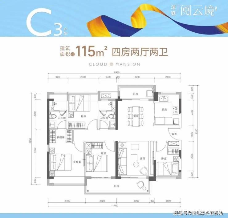 115㎡的4房2厅2卫(C3户型,仅1栋3单元01户型),设计的是竖厅南北通透格局,客厅3.45米开间,四开间朝南,双阳台设计,4个卧室分别做到了3.4米/2.8米/2.8米/2.3米的宽度,主卧大套房设计,客厅连接次卧出5.8米长的大阳台,U型厨房,得房率75-77%(不含赠送),大阳台主朝西南朝向。