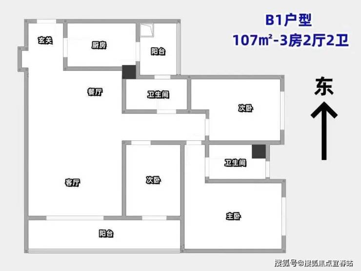 107㎡的3房2厅2卫(B2户型,1栋4单元03/04户型)设计的是经典竖厅格局,进门独立玄关,客厅3.5米开间,LDKB一体化设计,动静分区,3个卧室分别做到了3.15米/2.85米/2.65米的宽度,客厅连接次卧出6.35米长的大阳台,二字型厨房还带1个小生活阳台,得房率75-77%(不含赠送),阳台有朝西向、朝东向或朝南向。